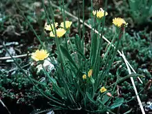 Each stalk terminates in a flowerhead about ½" across. This flowerhead consists of several spreading ray florets that are truncate with 5 teeth at their tips; these florets are bright golden yellow. The base of each flowerhead consists of 9-18 floral bracts in a single series; these bracts are lanceolate and about ¼" in length. They are erect while the flowerhead is blooming, but eventually become reflexed when the achenes mature. The blooming period occurs from mid-spring to mid-summer and lasts about 2–3 months for a colony of plants. The small achenes are bullet-shaped (tapered at the base, but truncate at the top). Each achene has 5 small scales and a tuft of 5 hairs at its apex; the hairs are longer than the scales. These achenes are distributed by the wind. The root system consists of a tuft of fibrous roots. This plant spreads by reseeding itself.[1]