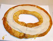 In the United States, kringles are hand-rolled from Danish pastry dough (wienerbrød dough) that has been rested overnight before shaping, filling, and baking.[5] Many sheets of the flaky dough are layered, then shaped into an oval. After filling with fruit, nut, or other flavor combinations, the pastry is baked and iced.[6]