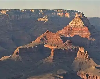 Krishna Shrine is a 6,131-foot-elevation summit located in the eastern Grand Canyon, in Coconino County of northern Arizona, US. The landform is attached at the southwest to the Vishnu Temple massif, about 1.0 mi distant. Krishna Shrine is about 3.0 mi south of the Cape Royal overlook, Walhalla Plateau (southeast Kaibab Plateau, North Rim). A twin landform occupies the southeast of Vishnu Temple, the Rama Shrine. Krishna Shrine towers about 4,000 ft above the Colorado River, about 2.0 miles south. Both Shrines, east and west, and Vishnu Temple, center, are at the headwater drainage of Asbestos Canyon. At the southwest of Krishna, on an extending arm of Redwall Limestone is a short unnamed drainage; (at the southwest is Newberry Butte at the Colorado River, and Granite Gorge). The west flank of Krishna Shrine drains into the long southwest-trending Vishnu Canyon and Creek, which comes from Freya Castle and the Walhalla Plateau, South Rim.