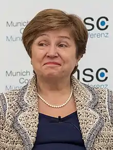 Kristalina Ivanova Georgieva-Kinova (Bulgarian: Кристалина Иванова Георгиева-Кинова; née Georgieva; born 13 August 1953)[1] is a Bulgarian economist serving as the 12th managing director of the International Monetary Fund since 2019. She was the Chief Executive of the World Bank Group from 2017 to 2019 and served as Acting President of the World Bank Group from 1 February to 8 April 2019 following the resignation of Jim Yong Kim. She previously served as Vice-President of the European Commission under Jean-Claude Juncker from 2014 to 2016.