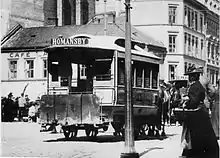 KSS had a concession which expired in 1905, at which time the municipality could purchase the company at par value. This raised a new debate concerning public or private operations, with many Conservative politicians calling for the privatization of KKS.[27] In the 1904 municipal election the issue was raised, with the Liberal Party and the socialist parties running for municipalization of tram operations. Meanwhile, the municipal administration worked with estimates for taking over KSS. A take-over would cost the municipality about NOK 2 million, while a sale would bring in about NOK 1.6 million. However, as KSS was a profitable company, it was estimated that the municipality would make more money by taking over KSS than selling KKS, estimated at about NOK 3 million for the period in question. The decisive municipal council meeting was held on 14 April 1905, although the actual vote did not occur until 02:00 hours the following day, after a nine-hour debate.[28] The Conservative majority voted in favor of selling KKS to KSS and extending the latter's concession to 1924.[29]