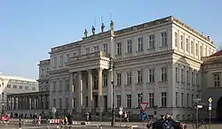 The Kronprinzenpalais (English: Crown Prince's Palace) is a former Royal Prussian residence on Unter den Linden boulevard in the historic centre of Berlin. It was built in 1663 and renovated in 1857 according to plans by Heinrich Strack in Neoclassical style. From 1919 to 1937, it was home to the modern art collection of the National Gallery. Damaged during the Allied bombing in World War II, the Kronprinzenpalais was rebuilt from 1968 to 1970 by Richard Paulick as part of the Forum Fridericianum. In 1990, the German Reunification Treaty was signed in the listed building.[1] Since then, it has been used for events and exhibitions.