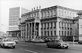 In 1968–69, to complete the restoration of the south side of Unter den Linden and make a suitable visual transition to the newly completed Foreign Ministry skyscraper (since demolished) and the rest of the East German government district immediately to the east, the Kronprinzenpalais was rebuilt with approximately the same exterior appearance as after Strack's work by Richard Paulick, a former associate of Walter Gropius who had already rebuilt the Kronprinzessinnenpalais and the State Opera,[48] and Werner Prendel.[4][47] (Paulick had originally intended to rebuild it as it had been in 1733, for use as a modern museum, music school, or performance space, but conceptions of the role of the area changed in the 1960s.[47]) However, the top floor was extended to include the east wing to improve the building's proportions,[4] and the interior (1968–70) was modern.[47] As the Palais Unter den Linden, it was used as a guest house by the Magistrat, the governing executive of East Berlin.[4][47] The Unification Agreement was signed there on 31 August 1990,[47] after which the Senate of Berlin took possession of the building.