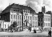 In 1856–57, Johann Heinrich Strack extensively rebuilt the palace for William I's son, Prince Frederick William (the future Kaiser Frederick III), giving it substantially its present appearance. Strack replaced the mansard roof with a third storey with Corinthian pillars, and added neo-classical details to the façade, whose columns he changed from Tuscan to Corinthian.[4] The four statues above the entrance remained,[5] but he added a tall columned portico surmounted by a balcony. He also built a setback addition on the east side of the building, with a colonnade on its Unter den Linden and Niederlagstraße sides.[4] After 1861, when Frederick William's father acceded to the throne and he became Crown Prince, the building was once again known as the Kronprinzenpalais; he resided there with his wife Princess Victoria, daughter of England's Queen Victoria.