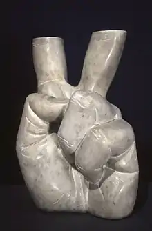 Signs is a series of monuments based on the left hand of the author. Maryla Sitkowska, a longtime critic and archivist of Bednarski's work, describes[8] them as sculptures of the hand which makes a special gesture. For example, Ticket shows an extended hand presenting a ticket. The most famous of Bednarski's gesture is Victoria-Victoria, sculpture of victory sign with cut fingers created during the Martial law in Poland (1981-1983). One of the versions of this sculpture was created in 1983 in France during the sculpting symposium in Digne-les-Bains. The sculpture shows V sign (of victory and freedom), but with the fingers cut off. The first version of this sculpture was created in Poland couple of years before.