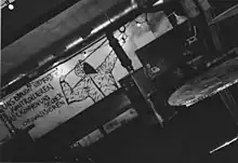 In the months that followed, however, despite city bans, regular sauvages were organised within the walls of the old factory, which were well attended and increased the enthusiasm to tackle the project again. This led to an escalation when, on 7 December 1991, the right-wing Rechtsradikale Mutschellenfront (RMF) entered the premises of the clothing factory and used them for their own purposes.[4] As a result of the incident, the Meyer brothers received a notice to wall up the property by 15 February 1992. At the same time, AEW Energie threatened to disconnect the property from the electricity grid.