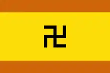 The Guna flag was adopted after the 1925 rebellion against Panamanian suppression. Horizontal stripes have a proportion of 1:2:1 and the central swastika is an ancestral symbol called Naa Ukuryaa. According to one explanation, it symbolizes the four sides of the world or the origin from which peoples of the world emerged.[5] In another explanation, it symbolises the octopus that created the world, its tentacles pointing to the four cardinal points.[6] Also known as the flag of Guna Yala island today, the flag was used for the province of San Blas until 2010 and also is used as the Guna ethnic flag. The central stripe, meaning peace and purity, is white on the official flag of the reservation, officially adopted by Guna National Congress, while yellow stripe is used on the ethnic flag (it was introduced on the flag at about 1940). In 1942, the flag was modified with a red ring (representing the traditional Kuna nose-ring) encompassing the center of the swastika because of Nazi associations; the ring was later abandoned.[7]