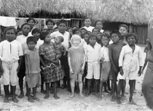 Guna people have a high incidence rate of albinism,[12] which led to their nickname of "White Indians" in the early 1900s.[13][14] In Guna philosophy, the albinistic people (or "sipu") were given a special place and are considered a special race of people.[12] They have the specific duty of defending the moon against a dragon which tries to eat it on occasion during a lunar eclipse, and only they are allowed to go outside on the night of a lunar eclipse and to use specially made bows and arrows to shoot down the dragon.[15]