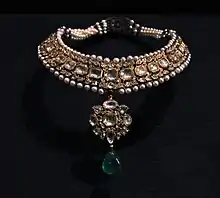 Kundan, meaning pure gold,[1] is a traditional form of Indian gemstone jewellery involving a gem set with a gold foil between the stones and its mount, usually for elaborate necklaces and other jewellery.[2][3]