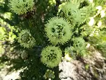 The flowers are arranged in spherical groups of 18 to 32, on the ends of branches which continue to grow after flowering. The flowers are cream-coloured to pale yellow and are surrounded by glabrous, egg-shaped bracts and bracteoles. The floral cup and sepals are each about 1 mm (0.04 in) long and the five petals are egg-shaped to almost round and 2–2.5 mm (0.08–0.1 in) long. There are about 50 to 70 stamens which are about twice as long as the petals and a style about 7 mm (0.28 in) long. Flowering occurs in October and November and is followed by fruit which are urn-shaped capsules about 6 mm (0.2 in) long.[2]