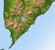 One caldera that formed in the area is the Pauzhetka Caldera, of middle Pleistocene age. As of 2004 the possibility that a later caldera existed in the Pauzhetka caldera was considered.[15] Kurile Lake is located in the eastern part of this Pauzhetka caldera, which has dimensions of 55 by 35 kilometres (34 mi × 22 mi). In the centre of the Pauzhetka caldera lies a 650 metres (2,130 ft) wide depression that covers an area of 25 by 20 kilometres (16 mi × 12 mi).[19]