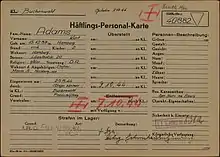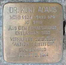 On 20 July 1944 an assassination attempt was made against Adolf Hitler. The dictator survived, but his regime had already prepared a list of several thousand names, to be used in the event of an escalation in political tension on the home front, and the name of Kurt Adams was on it. In the context of the wave of arrests known as "Aktion Gitter", on 24 August 1944 Kurt Adams was arrested at Greiz, where he was staying with relatives while recuperating from a serious operation earlier in the year.[1] He was taken to Gera nearby.[1] Four days later he was taken to the Buchenwald concentration camp, which was already overcrowded, with approximately 84,000 detainees.[1] On his arrival he was immediately recognized by other inmates, whose reactions to his arrival identified him to the guards.[1] He was separated out and placed in a sub-camp where the condition of the accommodation, food and hygiene were massively worse than in the main camp.[1] He quickly weakened and became ill: from later reports provided by fellow detainees he appears to have caught pneumonia, and was taken, on 15 September 1944, to the camp hospital where he received treatment and his condition may have improved. However, he was soon discharged back to the camp.[1] The family received two more letters from him, in the second of which, dated 26 September 1944, he wrote that he was getting better.[1] However, on 5 October 1944 he lost consciousness, and he died, probably of meningitis, on 7 October 1944.[1][8]