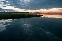 The lake is a part of the Kem River basin that drains into the White Sea in the Republic of Karelia, Russia.
