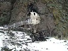 Kuys Varvara (the Virgin Barbara) is a revered religious figure in parts of Armenia, and the Tsaghkavank (Flower Monastery) is a cave shrine devoted to her on the southern slopes of Mount Ara.[1] The mossy cave is reported to contain a spring, held as sacred by some believers. An altar, ferns, and candle vendors are also around the shrine. Legend holds that Saint Barbara was martyred by her cruel father for espousing Christianity. She is one of the saints of the Armenian Apostolic Church.