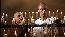 Years after his graduation, Caine traveled to the Forbidden City to meet Po, whose lifelong ambition had been to travel to a festival at the Temple of Heaven on that date, the full moon of May - the 13th day of the 5th month in the Year of the Dog (May 13, 1874). While they were talking together in the street, the Emperor's nephew and his entourage came along and an altercation ensued when a guard tried to push Po aside and was sent sprawling by the blind Shaolin. While defending himself from the other guards, Master Po was shot by the Emperor's nephew. Before the nephew could reload his pistol, the enraged Caine seized a guard's fallen spear and killed the Imperial nephew. With his dying words, Po gave Caine his pouch containing his few worldly possessions and instructed Caine to flee from China as there would be both no place to hide and a price on his head.[4] Before he fled China, Caine returned to the temple to confess his deed to Master Kan.[5] Later, Imperial guards attacked and stormed the temple, only to find it deserted (the monks had fled before the army's arrival); in retaliation, they burned the temple to the ground.