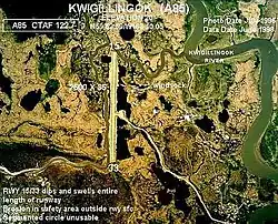 Kwigillingok Airport was the most dangerous airport that Alaskan commuter airline Ravn Alaska served,[6] with its sole runway boasting an incredibly narrow width of just over 40 feet. The runway is, essentially, on an island among the numerous creeks, rivers, and other water bodies that are common to the geographical region, as it spans a stretch of land roughly two thousand feet long and one hundred feet wide that connects to the mainland with sparsely placed, thin strips of land. The apron, and the short taxiway to the apron, are both located on one of these thin strips of land, making the taxiing of an aircraft extremely dangerous, as all parts of the airport have bodies of water that present a considerable hazard to aircraft on at least two (2) sides.