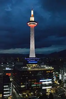 Kyoto Tower (京都タワー, Kyōto-tawā) is an observation tower located in Kyoto, Japan. The steel tower is the tallest structure in Kyoto with its observation deck at 100 metres (328 ft) and its spire at 131 metres (430 ft).[2] The 800-ton tower stands atop a 9-story building, which houses a 3-star hotel and several stores. The entire complex stands opposite Kyōto Station.[3]