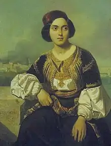 Kyra (Euphrosyne) Frosini was the niece of the Bishop of Ioannina and married to the wealthy merchant Dimitrios Vasileiou, with whom she had two children. She was a leading member of the local aristocracy in Ioannina and known for her beauty and intelligence. Ali Pasha had carved out his own semi-autonomous state within the Ottoman Empire centered in Ioannina. In his court he brought in intellectuals from all over Europe. Euphrosyne was the central figure and leader of a local parlour and group of intellectuals that celebrated the arts and literature.