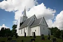 Lørenskog Church (Lørenskog kirke) is a medieval era church. The building material was brick and quarried limestone. The church dates to ca. 1150. The church is of rectangular plan and has 140 seats. In 1608 the church received a pulpit. The west tower was made of wood and was erected in 1864. In the tower hangs two church bells, the larger made in 1874. Its walls are one meter thick, and the stones are held together with lime mortar. The exterior and interior plaster was repaired during the 1600s and 1700s. In 1956 old plaster was removed and walls re-plastered and painted. The current outward opening door was inserted in 1946. [5] [6]