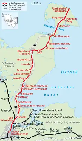 The tracks of the Kiel–Lübeck railway are used from Lübeck to Bad Schwartau. The line then runs along the Baltic coast through Timmendorfer Strand, Scharbeutz, Haffkrug and Sierksdorf. In the Neustadt in Holstein freight yard a branch line separates and runs to Neustadt station. The main line continues through eastern Holstein and runs via Lensahn, Oldenburg in Holstein, Großenbrode and after crossing the Fehmarn Sound on the Fehmarn Sound Bridge it ends at Puttgarden station on Fehmarn.
