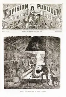 The first issue was published on January 1, 1870.[1][2] At first it was published weekly on Saturdays, but from April 28, 1870, it published on Thursdays. L'Opinion publique was the French-language counterpart to Canadian Illustrated News, also produced by George-Édouard Desbarats in Montreal. For these two publications, he collaborated with William Leggo, inventor of "leggotype", a technique that allows halftone printing from a photograph; Leggo and Desbarats held the patent jointly.[3] The Canadian Illustrated News had the reputation for being the first magazine in the world that could make, week after week, good reproductions of photographs; the first print it published using this technique, of Prince Arthur, attracted considerable attention when it was published in the October 30, 1869 edition of the magazine.[4] This technology met the needs of Desbarats, who advocated that images are "the most direct and most sure way to reach the mind."[4] Despite the similarities of the two journals - some illustrations and sometimes the same content from the Canadian Illustrated News were reused in L'Opinion publique - the two weeklies were independent and the journalists and collaborators were different.