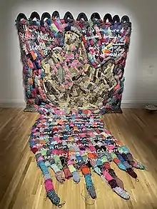 Their work has been shown in galleries and exhibitions throughout the United States.[5] A work of Roberts, The Queer Houses of Brooklyn in the Three Towns of Breukelen, Boswyck, and Midwout during the 41st Year of the Stonewall Era, was displayed in the Smithsonian American Art Museum.[2][13] The work, which was subsequently purchased by the Smithsonian,[14] was part of the 2012 40 Under 40: Craft Future exhibition in the Renwick Gallery, featuring artists born since 1972.[15][13] In 2017, Roberts worked publicly in the galleries of the Museum of Arts and Design as part of the exhibition Studio Views: Craft in the Expanded Field.[16] They knitted, sewed, and appliquéd a flat, life-sized van inspired by the 1970s queer van gang, the Van Dykes.[17]