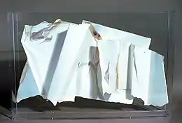 The painting comprises three torn pieces of Arches paper with abstract, minimalistic, watercolor paintings on them. The pieces of paper are attached roughly to a piece of Plexiglas. It signed and dated by Carter on the lower left of the piece.[1]