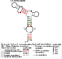 An L4 ribosomal protein leader is a ribosomal protein leader involved in ribosome biogenesis. It is used as an autoregulatory mechanism to control the concentration of the ribosomal protein L4. Known Examples were predicted in Archaeoglobi with bioinformatic approaches.[1] The structure is located in the 5′ untranslated regions of mRNAs encoding ribosomal proteins L3 (rplC), L4 (rplD), L23 (rplW) and L2 (rplB).[1]