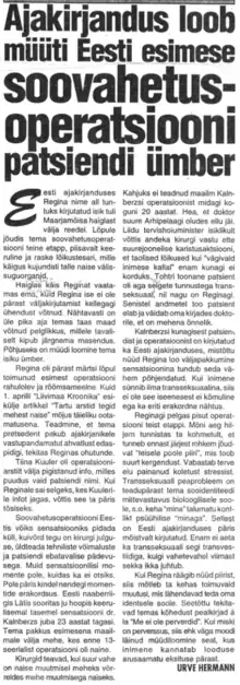 - ↑ Hermann, Urve (27 July 1993). "Ajakirjandus loob müüti Eesti esimese soovahetusoperatsiooni patsiendi ümber". DIGAR (in Estonian). Post. Retrieved 7 June 2023.