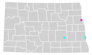 Map of North Dakota cities that had sexual orientation and/or gender identity anti–employment discrimination ordinances prior to Bostock[12][13]