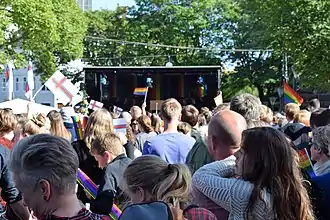 Despite the legislative attempts, the issue did not become a source of public debate until 2006, when openly gay musician and popular radio host Rasmus Rasmussen was assaulted by five men in Tórshavn.[28][29] Rasmussen's family members then began receiving threatening phone calls. However, the police refused to handle the case because there was no Faroese law banning discrimination against sexual minorities at the time. An internet petition collected 20,000 signatures from different parts of world, most of them coming mainly from Denmark, Iceland and the Faroe Islands themselves, urging the Faroese Parliament to legislate against discrimination based on sexual orientation.[30] At the same time, eight women from Tórshavn also collected 2,000 signatures via e-mail through collecting signatures around Faroese shops, tourist centers and gas stations.[31]