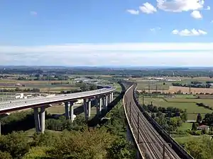 The LGV Rhône-Alpes (French: Ligne à Grande Vitesse; English: high-speed line) is a 115 km (71 mi) French high-speed rail line situated in the Auvergne-Rhône-Alpes region which extends the LGV Sud-Est southwards. Opened to service in 1994, the line bypasses the built-up Lyon area towards the east; in addition it serves Lyon-Saint-Exupéry TGV station (known until June 2000 as Satolas TGV station). Beyond Valence TGV station the line is continued by the LGV Méditerranée. LGVs Rhône-Alpes, Sud-Est and Méditerranée, when completed, received their official nickname, the City To Coast (C2C) Highway ("Ville à la Mer").