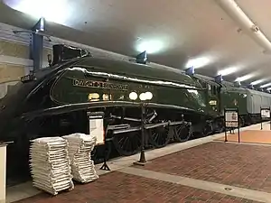 Earmarked for the National Railroad Museum in Ashwaubenon, a suburb of Green Bay, Wisconsin, the locomotive was cosmetically restored at Doncaster Works on 19 July 1963. The following spring, it was shipped to the US, arriving in New York Harbor on 11 May 1964.[1] Shipped by rail, it arrived at the museum later that month. In October 1990, it was moved to Abilene, Kansas for the celebrations of the centenary of Eisenhower's birth. The move both ways was done as a special train at slow speed, since the locomotive and two cars from the command train used the British vacuum braking system, which was incompatible with the American air-braked trains.