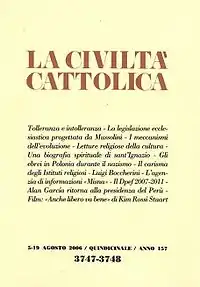 La Civiltà Cattolica (Italian for Catholic Civilization) is a periodical published by the Jesuits in Rome, Italy. It has been published continuously since 1850[1] and is among the oldest of Catholic Italian periodicals. All of the journal's articles are the collective responsibility of the entire "college" of the magazine's writers even if published under a single author's name.[2] It is the only one to be directly revised by the Secretariat of State of the Holy See and to receive its approval before being published.[3]