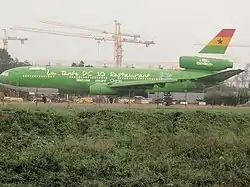 La Tante DC10 Restaurant is a restaurant located inside a converted McDonnell Douglas DC-10 formerly used by the defunct Ghana Airways. Formerly flying 380 passengers, it has been converted into a 118-seat restaurant with large numbers of the seats removed in order to provide adequate space for patrons and for the installation of dining tables.[1] An annex was attached to the right side of the fuselage to accommodate the kitchen.[2]