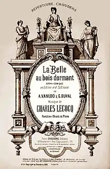 La belle au bois dormant (The Sleeping Beauty in the Woods) is an opéra comique in three acts with music by Charles Lecocq and words by Albert Vanloo and Georges Duval. It is a retelling, with modifications, of the fairy tale Sleeping Beauty. The princess wakes from her long sleep and falls in love not with Prince Charming but with his companion, but all is well in the end.
