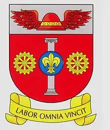 In red between two gears of gold is a silver upright-positioned column and note a round disk of blue charged with a fleur-de-lis of gold, on a silver chief a red mercuriushat.