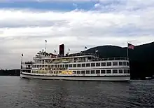 In the 1970s the Lake George Steamboat Company saw a demand for a ship that could carry more passengers, serve more and better food, as well as entertain more passengers. So, the company took action and started construction of the biggest ship it had ever made in Baldwin Shipyard.[6] The blueprints used for the boat were based on the Peter Stuyvesant,[7] a boat that used to run the Hudson River until it sank during the Blizzard of 1978.[8] Robert Simons was the marine architect that refined and designed the boat.[9] The final design ended up being ¾ the size of the Peter Stuyvesant boat on which it was based. This left the boat measuring 189 feet and 6 inches with a beam of 40 feet, making it the largest boat to ever sail the inland waters of the state of New York.[10] When it came time to name the boat, it was decided that it would be named the same as Lake George was initially in 1646 by Isaac Jogues. The Catholic hierarchy approved the name, the Lac du Saint Sacrement which means Lake of the Blessed Sacrament in French, as well. On June 15, 1989, a ceremony was held to christen the boat. And after many speeches and a blessing by Bishop Raymond Kalisz, the Bishop of the Roman Catholic diocese of Wewak, Papua New Guinea,[11] a bottle of champagne was smashed against the ship's capstan head to officially christen the vessel the Lac Du Saint Sacrement.