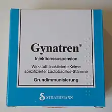 - ↑ Petersen EE (2005). "Impfung mit Gynatren – ergänzende Therapiemaßnahme bei Kolpitis" [Vaccination with Gynatren – a complementary therapeutic measure in colpitis]. Gynäkologische Praxis (in German). 29 (2): 224. ISSN 0341-8677.