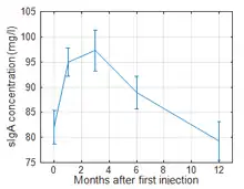 Multiple authors have proposed cellular immunological phenomena as the primary mediators of protective effect of lactobacillus vaccines.[2][44][45] Studies into cellular immunity are technically challenging in humans owing to the difficulty of sampling lymphoid tissues as opposed to secretions, and none has been performed so far on lactobacillus vaccines. A number of studies have been published on the humoral responses to primary and booster immunization in serum[3][14][41][23] and in the vaginal secretions.[46][13][4] Rüttgers identified mucosal secretory IgA as a strong immune correlate of vaccine efficacy.[4]