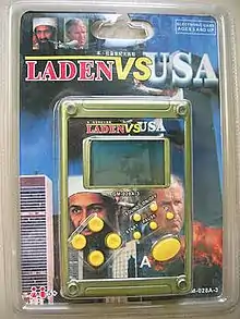 Laden VS USA (Chinese: 本·拉登世紀大挑戰:Laden VS USA; pinyin: Běn Lādēng shìjì dàtiǎozhàn; lit. Bin Laden's Challenge of the Century) is a LCD handheld electronic game supposedly created by Chinese company Panyu Gaming Electronic Co. Ltd.. It is unknown if the company actually manufactured the game due to mass counterfeiting in China. Laden VS USA was also released in two different designs. The game is based on the 9/11 attacks and features pictures of the actual wreckage on the packaging. Laden VS USA also bears the marks of "Made in China" and "Ages 5 and Up" on the packaging.