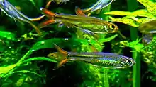 Ladigesia roloffi, the Sierra Leone dwarf characin, is a species of harmless African tetra that is found in Sierra Leone and Liberia, Africa.[2] L. roloffi is the only member of its genus.[3] The fish was named in honor of German aquarist Erhard Roloff (1903–1980), who collected the type specimen.[4] They are a social species generally living in schools at mid depths and surface level fresh water. It lives for five years. Ninety-seven percent of their natural habitat has been lost.[5]