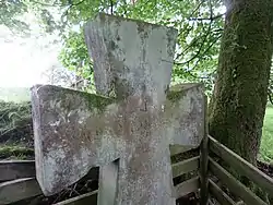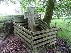 The substantial red sandstone cross is of an unknown date, almost certainly erected by the Campbells of Auchmannoch in the 19th century. It carries the inscription 'The Lady's Well' in flowing Old English script and also the date 'About AD 1258' representing when the lands were first granted to the Abbey of Melrose or possibly the date of the discovery of the well.[10] Postcards carry the inscription 'Wishing Well' and a pipe can be seen carrying the overflow flow from the well into the Stra Burn.[11] A substantial stone trough has been set into the ground with the cross at the top and a narrow secondary overflow appears to be present in addition to the aforementioned pipe that leads to the Stra Burn. A substantial amount of graffiti has been added to the cross over the years.
