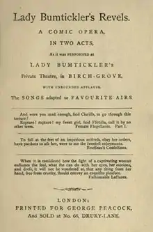 Lady Bumtickler's Revels is a pornographic book written as a spoof libretto for a comic opera on the theme of flagellation.[1] It was written and published by John Camden Hotten in 1872[2] in his series The Library Illustrative of Social Progress.[3][4] It purports to have been "performed at Lady Bumtickler's private theatre in Birch Grove, with unbounded applause".[5] The characters, Master Lovebirch and Lady Belinda Flaybum, praise the delights of masochism, for example: "the male sex may taste something exquisitely sweet in a whipping from the hands of a woman".[6]