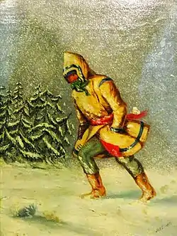 Lady Eveline was also known for her sleighing scenes in art. She was associated with this name due to the winter sleighing scene which was completed in watercolor and is theorized to have been given to the Bells as a keepsake of the "Sleigh Society." She had a tendency to often paint or draw winter scenes. An example of this is one of her drawings of an indigenous man trudging through a snowstorm.[6]