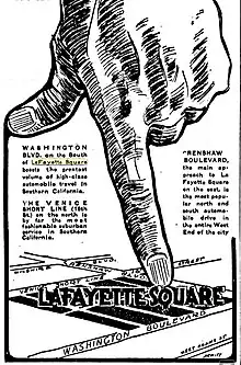 - ↑ "Many Lots in Lafayette Square Reported Sold Though No Formal Even Marked Opening. Was Part of Nadeau Rancho Vineyard," Los Angeles Express, November 20, 1912, image 19