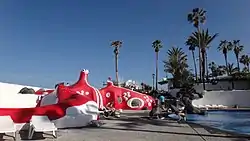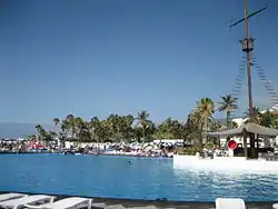 Lago Martiánez is an open-air swimming pool complex located in Puerto de la Cruz (Tenerife, Canary Islands, Spain). The leisure park with a total area of approximately 100,000 square meters is centered around an artificial lake. Lago Martiánez includes several islands, gardens, restaurants, bars, and terraces. Architect César Manrique designed the swimming pool complex with many volcanic rocks. Lago Martiánez is a mix of Manrique’s vision and local elements, such as bartizans, palisades and ocean views. In addition to the architectural structure, it also comprises a range of Manrique’s sculptures. Lago Martiánez, commonly known as "el Lago", was built in the so-called "Llanos de Martiánez" area, which was home to several natural pools (such as "la Coronela" and "la Soga"). The first tourists visited Llanos de Martiánez at the end of the 19th century and at the beginning of the 20th century.