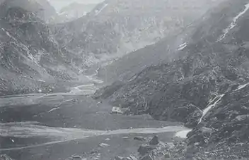 In order to make works possible, a sort of guesting village was established for 800 operators. There were 12 huts for workers and 2 huts for the chiefs placed in the area where nowadays Antonio Curò Shelter lies. Works were coordinated from a designated position situated slightly below Barbellino Plain, near Valmorta Lake. The armoury of the building site was located in Maslana, a small mountain town with typical stone houses at 1.200 m. It contained explosives for the demolition of the rock necessary in order to insert the new frameworks of the dam in concrete. The explosives were carried by the operators' shoulders. Walking upwards for one hour and a half, they reached the building site of the dam. Those operators needed to be careful due to the high danger of the load.[10] Unfortunately, something happened: many operators charged of transporting the explosives were women, among them one lady stumbled and fell with the box of dynamite which killed her and other 2 women. The tragedy happened on the 25th of 1919 and in their memory, a commemorative plaque was built along the path of Maslana.[11]