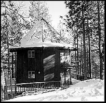 In the early years of development, the architectural committee of the resort community mandated that homes be built in the French Norman or English Tudor Style. Rudolf Schindler, a modernist architect, designed what is known as the first modern A-frame house in 1936 for Gisela Bennati, as his interpretation of French Norman style architecture. The first known sketches for the Bennati Cabin date from 1934.[29] Schindler did sketches for "triangle-based house designs" as early as 1922, but none of those designs were built.[30] Lake Arrowhead is also home to what has been sometimes referred to as the world’s largest A-frame structure, the clubhouse of the Lake Arrowhead Country Club.