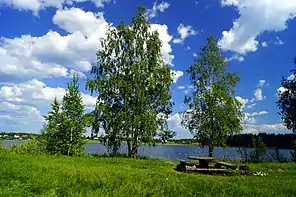 Lake Beloye (Russian: Бе́лое о́зеро, IPA: [ˈbʲɛləjə ˈozʲɪrə] — literally White lake) is a lake in Klepikovsky District, Ryazan Oblast, Russia. It is notable for its relatively great depth for the region - 50 metres (160 ft) - created as a deep gouge in the landscape in the most recent glaciation.[1] The lake is located in the Meshchyera Lowlands, a glacial alluvial plain of swampy lowlands, gravelly moraines and limestone bedrock.[2] It was once connected by an artificial canal to Lake Velikoye ("Grand Lake", a much larger lake with a surface area of 20 square kilometres (7.7 sq mi)). The canal was filled in 2009. Lake Beloye is surrounded by pine forests, with reeds and sedge predominating on the shore. It is a popular lake for recreation and fishing, being home to pike, carp and other fish.